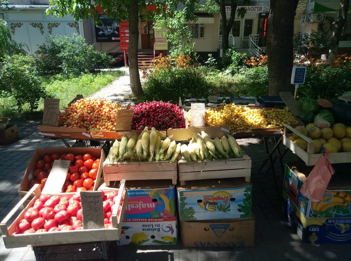 Вот и закончился мой карантин по приезду из РФ в Одессу. Теперь я могу выходить на улицу, общаться с толпой подружек и ходить на целый день на пляж. Но для начала я решила сходить на местный рынок или, как у нас его называют, "на дорожку". Напротив моего дома стоят два супермаркета и строят третий (видно на фото). Скоро супермаркетов будет как в Курске, который в народе называют "городом церквей и супермаркетов". Иду дальше. Особой популярностью у нас пользуются так называемые "трешки" - аналог Фикс Прайса, но с очень скудным ассортиментом и грустным качеством. Подхожу к "дорожке". Недавно там поставили этот магазинчик, год назад его не было. Впускают только в масках и не больше 10 человек. К слову, такой строгий масочный режим соблюдается далеко не везде. И понеслась... Наша "дорожка" знаменита тем, что там можно купить очень дешевые фрукты-овощи, одежду, игрушки, подать "на строительство церкви, поглазеть на раритетное старье или просто обязательно встретить знакомого - это просто
