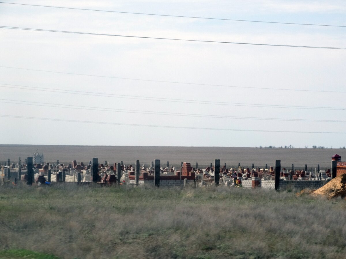 Посреди этой бескрайней степи находятся три вышеназванных посёлка. Первый и самый крупный - это Верхний Баскунчак. Основан в 1884 году, статус рабочего посёлка получил в 1936 году. Население - 7860 человек. Вдоль трассы перед посёлком расположено кладбище. Особенно выделяются мусульманские могилы, их необычный внешний вид. Сколько их видел по дороге в Астрахань, всегда удивляли, обнесённые кирпичной кладкой, могилы. Они выглядят очень необычно. У нас в Волгоградской области я таких кладбищ не видел. А в Астраханской области они есть в каждом населённом пункте.