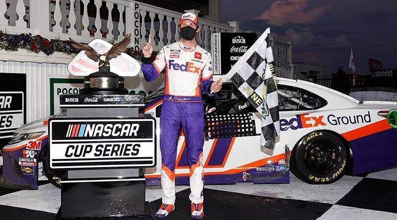 «Pocono 350» — вторая часть исторического двойного этапа серии NASCAR на гоночной трассе «Pocono Raceway» — была отмечена в воскресенье с получасовой задержкой из-за молнии, перерывом на один час из-за дождя и была почти преждевременно завершена, потому что наступила темнота. Хотя солнце садилось за несколько минут до дистанции и на трассе «Pocono Raceway» нет системы искусственного освещения, все 140 кругов были пройдены. Победа была сделана из двух гонщиков, которые боролись за победу в субботу: Денни Хэмлин из «Gibbs-Toyota» и Кевин Харвик из «Stewart/Haas-Ford». Если именно Харвик одержал победу над Хэмлином в субботу на 0,7 секунды, Хэмлин вернул услугу в воскресенье. Он выиграл на три секунды впереди над Харвиком, одержав свою четвертую победу в сезоне 2020 года. На трассе «Pocono Raceway» это шестая победа для Хэмлина, ставшая повторением рекорда Джеффа Гордона. После того, как стартовая решетка для первой гонки в Поконо была составлена заранее, вторая гонка начиналась с обрат