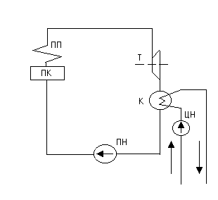 Основным циклом паросиловых установок (ПСУ) является цикл Ренкина. Схема ПСУ приведена на рис.1. Пар из парового котла (ПК) поступает в пароперегреватель (ПП), откуда он направляется в турбину (Т), где совершает полезную работу, и далее в конденсатор К. В конденсаторе с помощью охлаждающей воды, подаваемой циркуляционным насосом (ЦН), от пара отводится теплота и он конденсируется. Образовавшийся конденсат питательным насосом (ПН) подается в котел, и весь цикл повторяется вновь.
