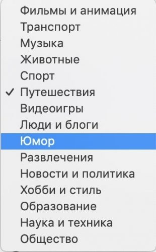 Полный перечень категорий есть на YouTube. Его можно увидеть в меню при загрузке видео на канал.