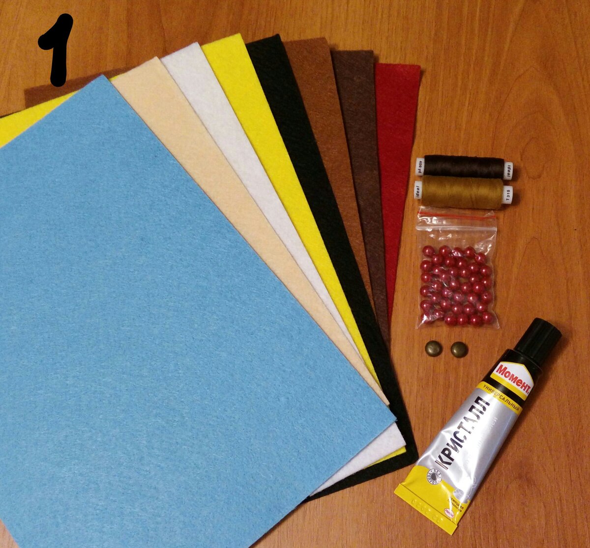 1. Для работы нам понадобятся: картон 20х30см. Фетр: голубой, белый, черный, желтый, красный, телесный, темно-коричневый, светло-коричневый. Две полубусины для сережек. Красные бусины 14-15шт. Ажурная белая рюшь 20см. Нитки швейные коричневые. Краска по ткани черная и белая. Клей "Момент Кристалл" или клеевой пистолет. 2. Рисуем эскиз аппликации. 3. Из фетра вырезаем детали аппликации: из телесного - шею, лицо и уши. Из красного - губы. Из белого - детали платка. Из темно-коричневого - брови и глаза. Из светло-коричневого - волосы. Из желтого- лепестки подсолнуха. Из черного зрачки глаз и середину подсолнуха. 4. На голубой фетр наклеиваем шею, лицо. Под края лица подклеиваем уши. 5. На лицо наклеиваем губы и волосы. Сбоку полукругом наклеиваем лепестки подсолнуха. 6. Наклеиваем коричневые глаза, черные веки, брови. Черной краской рисуем ресницы, белой рисуем блики на глазах. На швейной машинке или вручную на детали волос прошиваем рисунок в виде прядей волос. Карандашом рисуем ноздри.