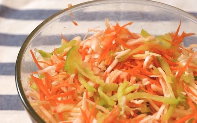 На этом базовый рецепт заканчивается. Скидываем порезанные овощи в миску заправкой и хорошенько жмякаем, чтобы пустить сок.