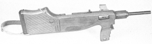 Первый прототип был создан явно под воздействием каких-то веществ, так как прицельные приспособления отсутствовали как таковые, да и прикладка ПП к плечу не предусматривалась, Дерек решил, что стрелять из этого "PDW" будут от "бедра", зажав некое подобие приклада подмышкой. Несмотря на е*анутость идеи Артиллерийский Департамент решил провести испытания и выделил Дереку небольшие деньги на создание прототипов для испытаний, и к февралю 1943 года Королевский завод стрелкового оружия (Royal Small Arms Factory) изготовил 2 прототипа. По сути это были Sten Mk.III в деревянном корпусе. Корпуса были выполнены из двух полых частей скрепленных вместе винтами, рукоять взведения затвора располагалась сверху, а пистолетная рукоять и сп