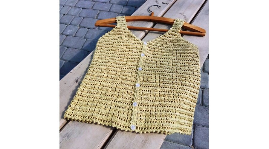 А еще мне понравилось вязать модель топа-майки с застежкой на пуговицах. Представляю вам очередной проект любимым фасоном и желанным узором.
