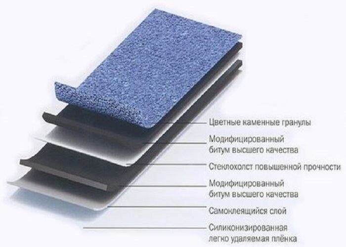 Основными игроками на российском рынке являются такие компании как: ICOPAL, IKO, Руфлекс (Katepal), Технониколь, CertainTeed и другие. СТРОЕНИЕ БИТУМНОЙ ЧЕРЕПИЦЫ Мягкая битумная черепица имет довольно сложное строение, каждый слой несет определенные функции, что в совокупности делает данный вид кровельного покрытия одним из самых надежных, долговечных и удобных. В целом гонты битумной черепицы представлены следующими слоями: Базальтовая посыпка, минеральная или сланцевая крошка – это декоративная часть, от нее зависи