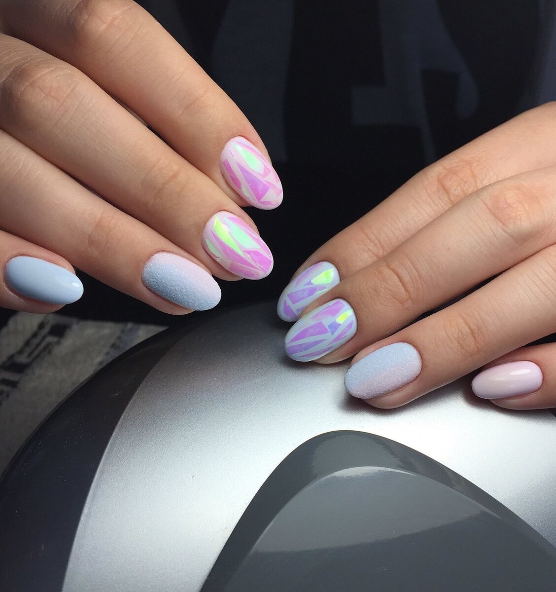 Красиво смотрится техника "битое стекло". Отлично гармонирует с пастельными и нюдовыми оттенками. Также можно добавить стразы или блестки.