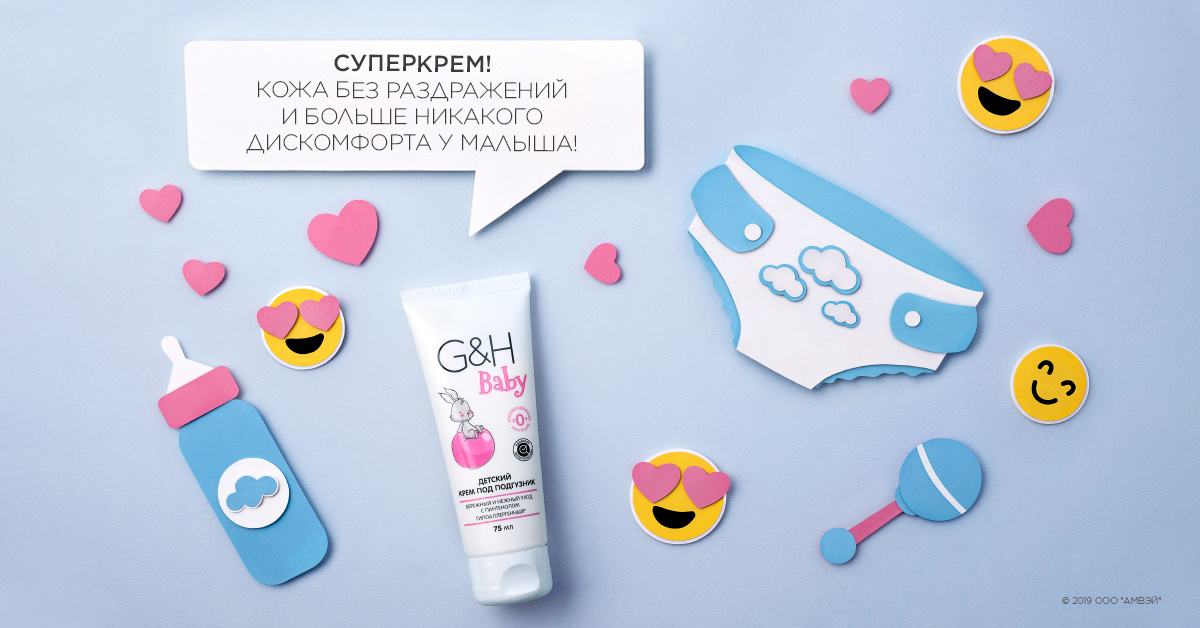 Детский крем под подгузник G&H Baby специально разработан для ухода за детской кожей с первых дней жизни. Предотвращает появление опрелостей, успокаивает и снимает ощущение дискомфорта. Пантенол, экстракты алоэ и ромашки, входящие в состав крема, обладают ухаживающим и смягчающим действием. Дерматологически протестирован, подходит для чувствительной кожи* Не содержит парабенов и красителей. Преимущества Пантенол оказывает успокаивающее действие на кожу с покраснениями и раздражениями. Содержит экстракт ромашки и сок алоэ, которые увлажняют и смягчают кожу. Без парабенов и красителей. Разрешительные документы: Свидетельство о государственной регистрации (PDF, 800 KB) Заключение о прохождении клинических исследований (PDF, 2.7 MB) *Максимально снижен риск возникновения аллергических реакций. Теперь меня и моего малыша ничто не отвлекает от веселых игр! Все знают, что нежная детская кожа склонна к опрелостям, особенно при использовании подгузников. Для того чтобы защитить нежную