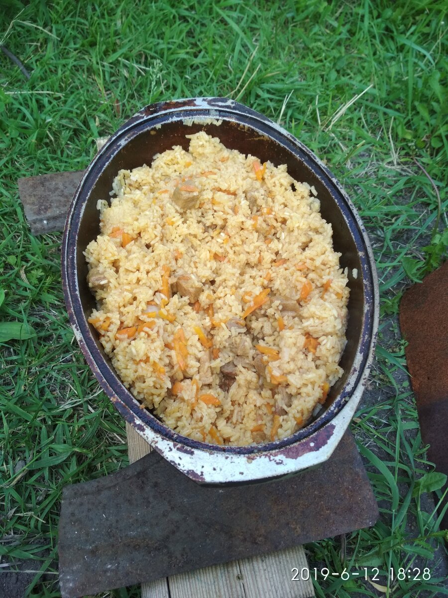 Всем привет! Посетила меня тут мысль о том, что стройка стройкой, а отдыхать тоже надо. Тем более погоды стоят. Люблю иногда полакомить семью вкусностями. Шашлычок, рыбка копченая, пловчик... Сегодня поделюсь рецептом, как я делаю плов. Думаю не секрет, что плов гораздо вкуснее получается, если его готовить на дровах, не на газу. Кстати этот рецептик подглядел у своего одноклассника. Буду честным и упомяну его заслугу в этом. Ингридиенты: Вообщем я делаю так: Перед тем как засыпать мясо я в масло добавляю ложку мёда. Потом в раскаленное масло засыпаю мясо. Полкило порезанного небольшими кубиками. Минут 20 тушу это дело. Потом засыпаю порезанные 3 морковки и 3 луковицы. Ещё минут 20 тушу. Потом засыпаю приправ (ну тут по вкусу). Потом рис. Примерно на 2 сантиметра над мясом. Воду лить через ложку чтоб рис не шевелить, я наливаю на 2 пальца над рисом, этого хватает. И оставляю эту историю на 40 минут под крышкой. Рис не шевелить (не мешать) это важно!!! Получается очень вкусный, рассы