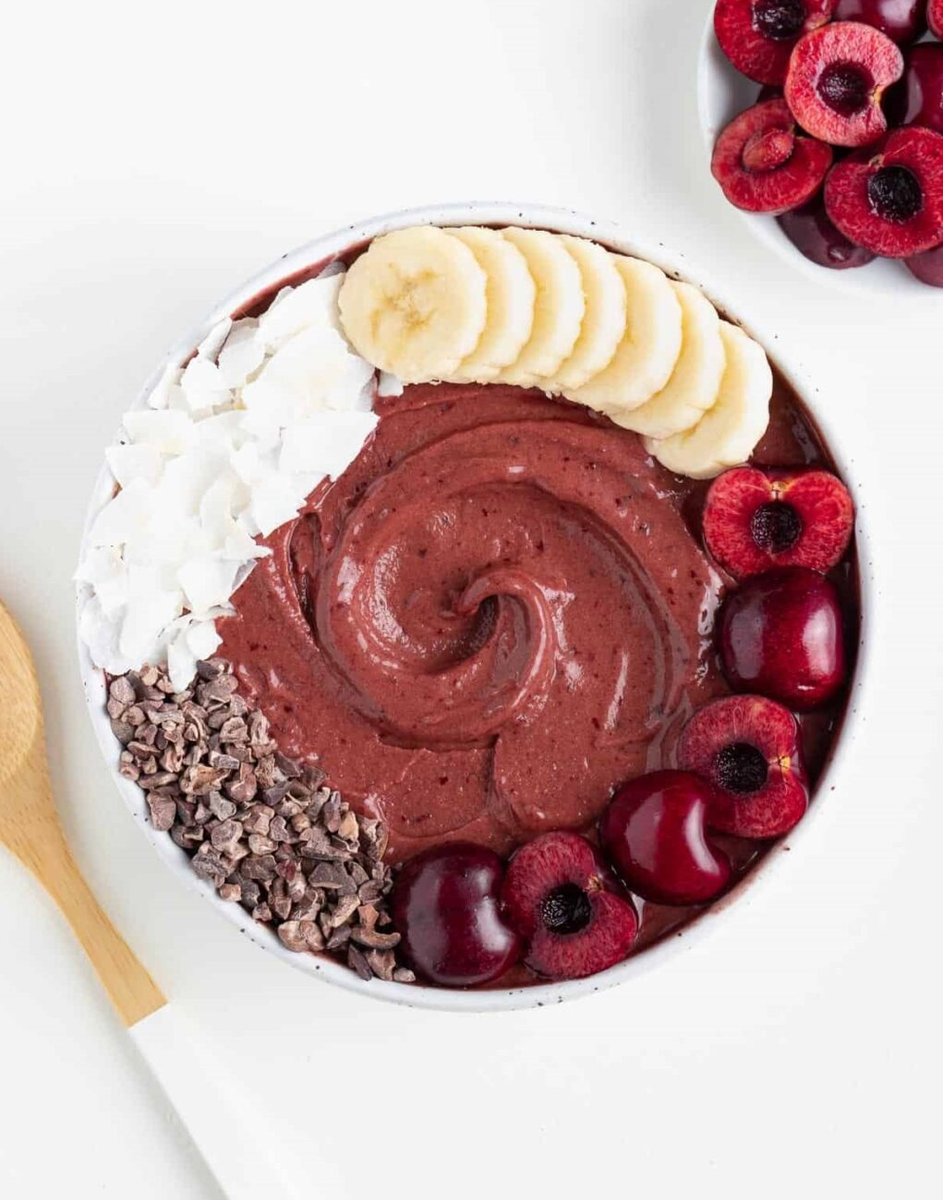 Утро должно начинаться с хорошего настроения, а также с вкусного, питательного завтрака! Смузи боул готовится всего за 5 минут, а в жаркий летний день его свежая прохлада это просто спасение. Комбинация вишни и шоколада всегда выигрышна! Вы часто найдете это сочетание в различных десертах. Главный принцип смузи боула это использование замороженных фруктов и ягод. Это помогает сделать текстуру блюда густой, похожей на мягкое мороженое. Также, используйте минимально возможное количество жидкости. Лучше всего начинать с наименьшего количества растительного молока. Вы всегда можете добавить больше, если этого потребует ваш блендер. Я украсила свой смузи боул кокосовыми хлопьями, шоколадной крошкой, нарезанным бананом и свежей вишней. Другие варианты топпингов могут включать чернику, мюсли, орехи или семена. Ингредиенты: ДЛЯ ТОППИНГА: Способ приготовления: Смешайте все ингредиенты для смузи в высокоскоростном блендере или кухонном комбайне до получения густой однородной консистенци