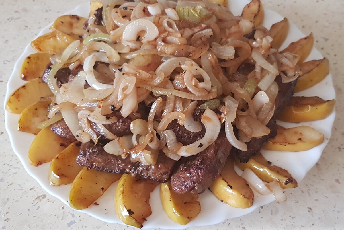 12. Добавляем в сковородку еще 1 ст.л.масла (к тому что имеется, в котором жарились яблоки и печень). Обжариваем лук, добавив щепотку соли, до легкого румянца.