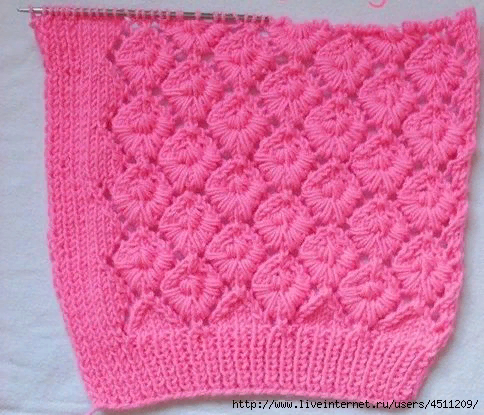 Рапорт узора состоит из 8 петель + 2 кромочные. Все изнаночные ряды вяжутся изнаночными петлями.