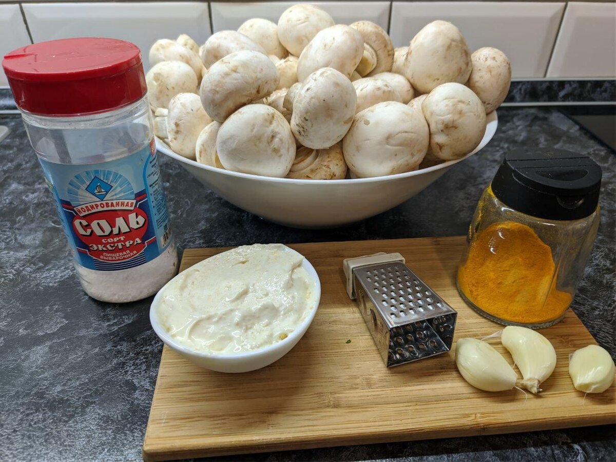 Отличным дополнением к шашлыку являются запеченные на решетке гриль грибы. Шампиньоны по этому рецепту получаются очень ароматными с чесночно-сливочным вкусом. Нам потребуется: Подготовка: Тщательно моем грибы (если есть время можно замочить на 30 минут в воде), главное смыть мелкие частички земли. Желательно, чтобы грибы были одинакового размера. Так они более равномерно пропекутся на решетке гриль. При необходимости подрезаем ножки грибов (в случае если срез темный). Трем чеснок на мелкой терке или используем чеснокодавку. Смешиваем сметану (майонез) с куркумой, чесноком и солью. Маринуем грибы Пересыпаем грибы в целлофановый пакет (обычно использую один или несколько плотных мусорных пакетов), добавляю в пакет смесь сметаны (майонеза) со специями и чесноком и хорошо перемешиваем (трясём грибы в пакете). Грибы маринуются от 30 минут до 2х часов (можно оставить на ночь) Приготовление Выкладываем на решетку грибы одним слоем. Жарим, как правило, после мяса, жар от углей средний,