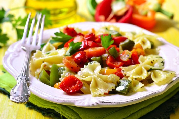 4. Положите сваренную пасту к сырно-овощной смеси, размешайте, добавив измельченную рукколу.