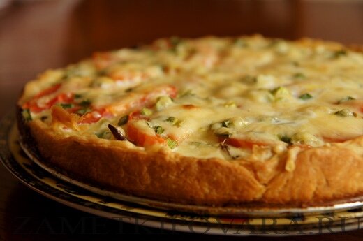 3. Раскатайте в прямоугольник слоеное тесто, переложите в формочку и проколите в некоторых местах вилкой. Поверх теста положите приготовленную начинку. Сыр порежьте на ломтики, выложите на начинку.