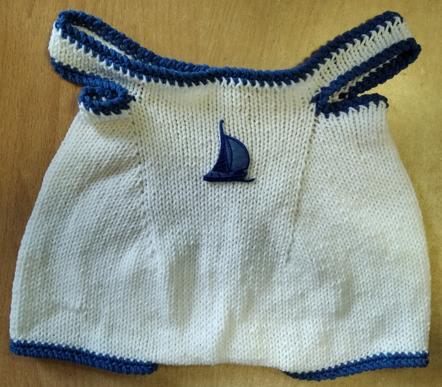 Для работы использую пряжу "YarnArt Jeans" (55% - хлопок, 45% акрил, 50 г / 160 м ) цвет синий джинс (16) и белый (01), спицы №4, аппликация "кораблик".