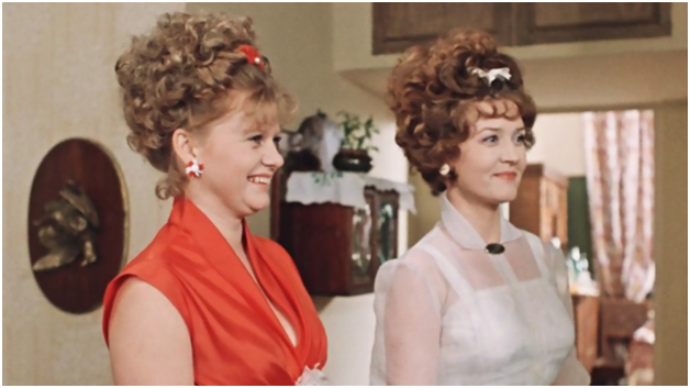 Всем привет, сегодня с вами Настя и…женской грусти пост. О самых стильных прическах в кино, которые повторить своими силами дома ну никак не получается. И кому-то, наверное, этот короткий список покажется слишком… экстравагантным, потому что в нем нет Керри Бредшоу и героинь сериала «Друзья», но… Честно признаюсь, каждый раз, когда вижу в кадре эти головы, искренне завидую мастерам, способным сотворить такое чудо. Во- первых, их удивительному чувству прекрасного — потому что прически гармонируют с героинями. Во —вторых — разумеется, мастерству. Пятое место: перспективные женихи и башни на головах потенциальных невест Да, какими бы простыми ни казались прически героинь «Москва слезам не верит», сделать такую дома не представлялось возможным в те времена (да и сейчас тоже сложновато будет). Вол первых — нужно правильно начесать завитые волосы (а правильно начесывать волосы — целая наука), во вторых, чтобы зафиксировать всю эту красоту нужна не только уйма шпилек, но еще и куча укладо
