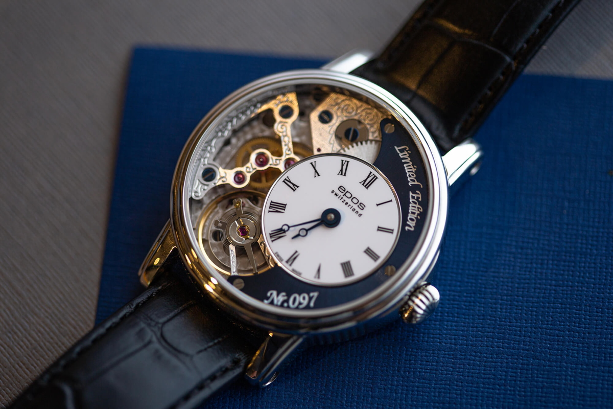 Швейцарские часы Epos относятся к лимитированной линейке OEUVRE D’ART и выпущены в ограниченном количестве. Главными отличительными особенностями модели выступает открытый часовой механизм (полускелетон) и дополнительная функциональность. Так, на тыльной стороне Epos 3435.313.20.25.25 находится пульсометр, откалиброванный на определение частоты сердечных сокращений на основании замера 20 ударов. Надо начать отсчет, когда стрелка находится на отметке старт, и счетчик определит ваш уровень пульса.