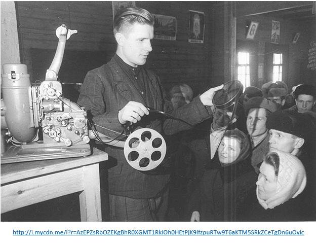 «Вы должны твёрдо помнить, что из всех искусств для нас важнейшим является кино» В.И. Ленин. 😉 Моё знакомство с кино началось с просмотра популярных лент с обратной стороны экрана. Дело в том, что в зале, который ранее был домовой церковью богадельни не предполагалось мест для малышни и мы пробирались за экран, где были свалены гимнастические маты. Как я теперь понимаю, сцена была устроена на месте алтаря, а экран висел так, что за ним оставалось довольно много места для спортивного инвентаря. Вот там мы и сидели. Прости, Господи! Такое было время… Маты были мягкие, изготовлены из ваты, обтянуты брезентом – время послевоенное… Но было мягко и комфортно, можно было смотреть лёжа, как теперь на диване, да заодно и к спорту приобщались… Конечно, смотреть с обратной стороны экрана было весьма забавно, но это было кино! Помню, что кинопроектор был марки «Украина» с выносными динамиками, похожими на большие чёрные чемоданы. Кстати, динамики устанавливались на сцене, так что слышно бы