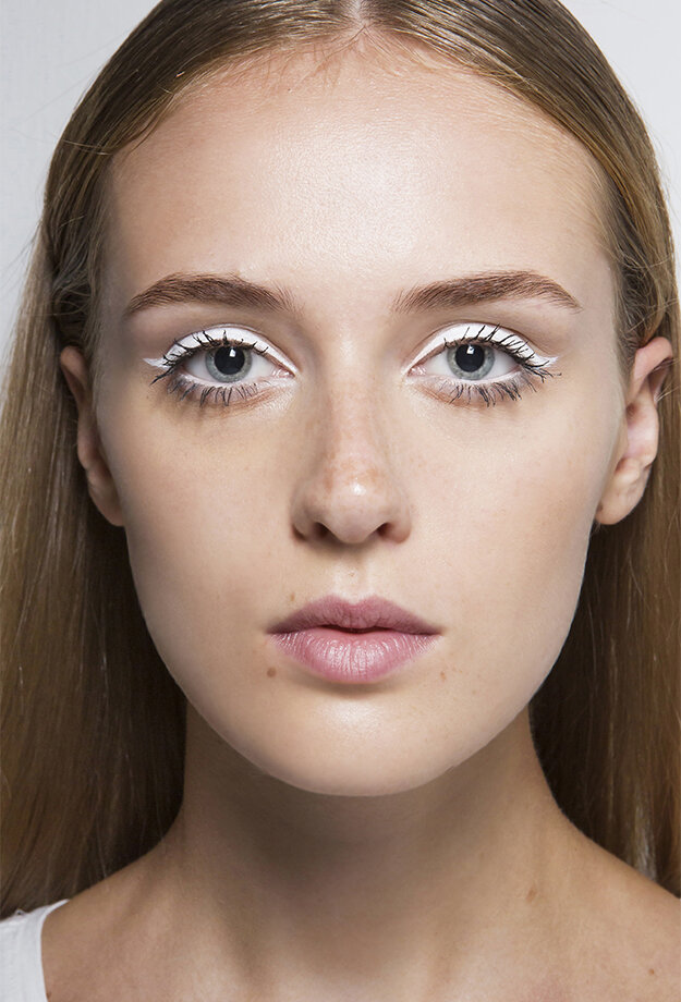 1 БЕЛАЯ ПОДВОДКА Белая подводка выглядит инопланетно и подходит практически всем. Ее можно интересно обыгрывать яркими цветами тушей для ресниц, хотя в образе для показа Laura Biagiotti стилист Aldo Coppola Кьяра Чима использовала классическую черную. Она нарисовала довольно толстые стрелки на верхнем веке и подчеркнула слизистую нижнего. 2.РОЗОВЫЕ КОШАЧЬИ Кошачьи стрелки могут выглядеть совсем иначе в ярком цвете. Стрелки cat eye должны быть острыми, кончик — вздернутым и далеко выходящим за пределы глаз как во внутреннем уголке, так и во внешнем. Такая стрелка должна растягивать и визуально приподнимать глаза. 3.NEGATIVE SPACE Изящные стрелки, выполненные в технике negative space, несложно повторить самостоятельно. Удобнее всего использовать подводку-фломастер или кисть с плотным ворсом для подводки или с фетровым аппликатором. 4. ЦВЕТ И СТРАЗЫ Эта идея была представлена на осенне-зимнем показе Prada 2018/19. Автором графичных стрелок стала Пэт МакГрат. Яркими тенями визажис