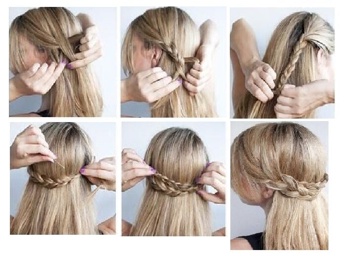 Отделяем часть волос над ушами и с двух сторон делаем внахлест, закрепляя невидимками. Достаем несколько прядей, чтобы добиться объема. Далее с каждой стороны берем прядь и делаем внахлест с каждой стороны. Кончики волос закрепляем резинкой и оборачиваем, закрепляя.