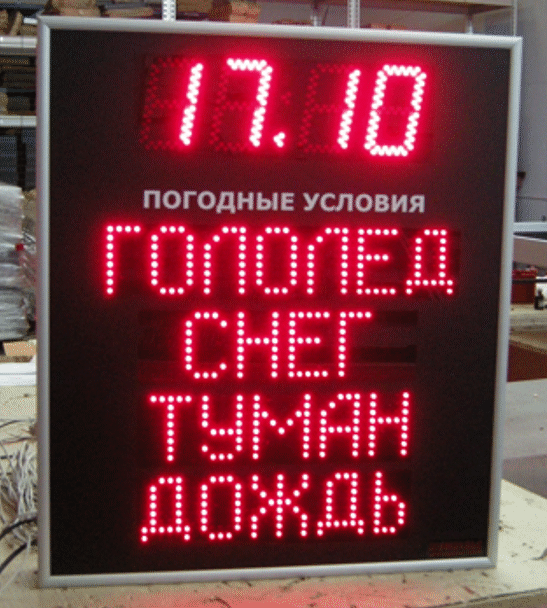 Электронные светодиодные метеотабло, дополненные данными о погодных условиях относят к категории табло погодных условий. Помимо данных о текущем времени и / или дате, температуре воздуха и т.д, табло этого вида отображают погодные или дорожные условия в текстовом формате: снег, гололед, дождь, туман, метель, град Эти показания устанавливаются пользователем вручную с помощью ДУ пульта на ИК. лучах. Компания "Индустрия Света" поставляет различные табло погодных условий различных конфигураций Стандартно, погодные условия отображаются на нескольких индикаторах - по количеству заявленных погодных условий. Однако есть и более компактные табло - погодные условия отображаются на одном единственном индикаторе или двух индикаторах. В этом случае свечение переключаться пользователем по мере необходимости. Электронные светодиодные табло, информирующие о погодных условиях, или табло погодных условий часто используют на предприятиях общественного транспорта, в крупных логистических комплексах