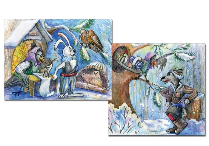Нагрянул в лес холодный февраль. На кусты сугробы намёл, деревья инеем опушил. А солнышко хоть и светит, да не греет. Пригорюнились птицы и звери: как дальше жить? Хорёк говорит: —Спасайтесь, кто как может! А Сорока стрекочет: — Опять всяк сам за себя? Опять поодиночке? Нет чтоб нам сообща против общей беды! И так уж все про нас говорят, что мы в лесу только клюёмся да грызёмся. Даже обидно… Тут Заяц ввязался: — Правильно Сорока стрекочет. Один в поле не воин. Предлагаю создать Бюро лесных услуг. Я вот, к примеру, куропаткам помочь могу. Я снег на озимях каждый день до земли разрываю, пусть они после меня там семена и зелень клюют — мне не жалко. Пиши меня, Сорока, в Бюро под номером первым! — Есть-таки умная голова и в нашем лесу! — обрадовалась Сорока. — Кто следующий? — Мы следующие! — закричали клесты. — Мы шишки на ёлках шелушим, половину шишек целыми вниз роняем. Пользуйтесь, полёвки и мыши, не жалко! «Заяц — копатель, клесты — бросатели», — записала Сорока. — Кто следующий? —