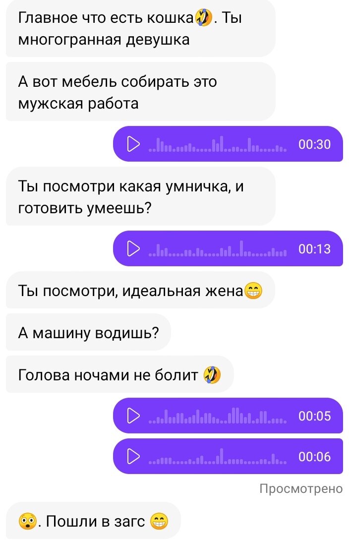 Ох сколько раз я слышала эти слова. 🤦🏻♀️ Особенно если ты проводишь время на сайте знакомств. Вообще мужчины не так уж и сильно стремятся пойти со своей половиной в ЗАГС, если только дама сердца не говорит в лоб о том, что она хотела бы пойти замуж в белом платье и прочей атрибутике. Но под влиянием общественного мнения, а точнее социального стереотипа всё меняется не в лучшую сторону, для мужчин. Они впитывают в себя установку, что им крайне необходимо сходить и показать государству с кем же он спит и ведёт свой быт. Ведь обязательно какая-нить соседка начнет говорить о том, что не християнски они живут и вообще "женится вам пора". Только с чего и откуда они берут это умозаключение - остается загадкой. С одной стороны - это стремление узаконить отношения оказываются прекрасным, ведь для девушки появляется какая-то облачная, но гарантия стабильности "всё это уже мой мужчина и мне его государство под роспись отдало", с другой же стороны - зачастую желание девушки надеть белое плать