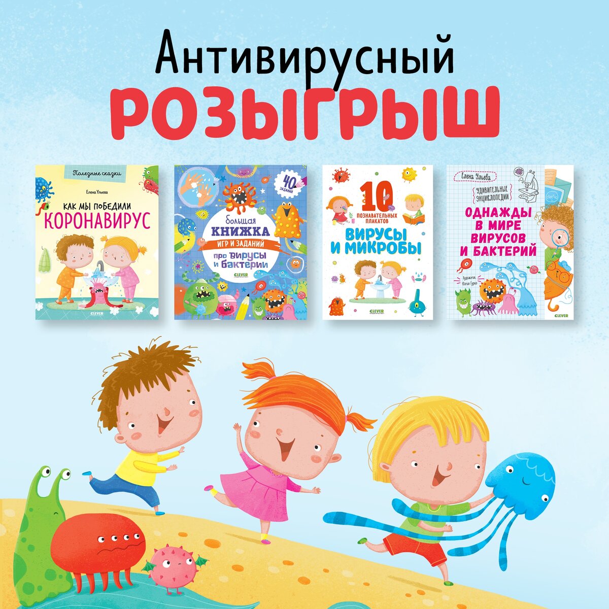 Дарим набор из 4 книг, которые помогут рассказать ребенку о вирусах, бактериях, теле человека и объяснить, почему важно заботиться о своем здоровье. «Удивительные энциклопедии. Однажды в мире вирусов и бактерий» «Большая книжка игр и заданий про вирусы и бактерии» «Полезные сказки. Как мы победили коронавирус» «Удивительные энциклопедии. Вирусы и микробы. 10 познавательных плакатов» Условия участия ищите в группе ВК Результаты конкурса объявят 7 июля. ВСЕМ Удачи!