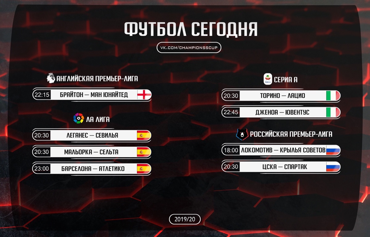 Расписание матчей на сегодня: 🇷🇺РПЛ ⏰18:00 Локомотив — Крылья Советов (МАТЧ ТВ) ⏰20:30 ЦСКА — Спартак (МАТЧ ТВ | ТВ Футбол Таджикистан) 🇪🇸Ла Лига ⏰20:30 Леганес — Севилья (МАТЧ-Футбол 3 | Телеспорт | Футбол 2 | Сетанта Спорт | Silk Sport 1) ⏰20:30 Мальорка — Сельта (МАТЧ-Футбол 1 | Телеспорт | Футбол 3) ⏰23:00 Барселона — Атлетико (МАТЧ ТВ | Телеспорт | Футбол 1 | Сетанта Спорт | Кентрон ТВ | Варзиш ТВ | Silk Universal | ТВ Спорт Туркменистан | Futbol TV Узбекистан) 🏴АПЛ ⏰22:15 Брайтон — Манчестер Юнайтед (Okko | Сетанта Спорт Украина | Беларусь 5 | Сетанта Казахстан | Idman TV | UZReport TV | TV3 Sport Baltic) 🇮🇹Серия А ⏰20:30 Торино — Лацио (МАТЧ-Футбол 2 | Телеспорт | Футбол 1 | CBC Sport Сетанта Спорт+ | Варзиш ТВ | ТВ Спорт Туркменистан | Futbol TV Узбекистан) ⏰22:45 Дженоа — Ювентус (МАТЧ-Футбол 2 | Телеспорт | Футбол 2 | CBC Sport | Сетанта Спорт+ | ТВ Футбол Таджикистан) 🇵🇹Примейра 🕖19:00 Фамаликан — Портимоненси 🕘21:15 Гимарайнш — Сетубал 🕦23