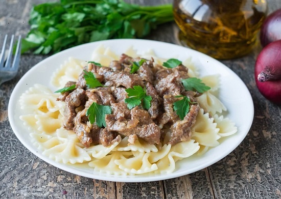 - Разогреть сковороду, и обжарить мясо на большом огне в течении 2 минут постоянно помешивая. Переложить в форму для запекания с крышкой.
