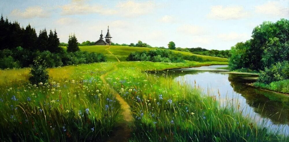Сергей Курицын любит прорисовывать детали на своих картинах. В работе «Цветущий июль» можно рассмотреть множество цветов и листьев на деревьях, а на картине «Морозное утро» снег прорисован на каждой иголочке хвойных деревьев.