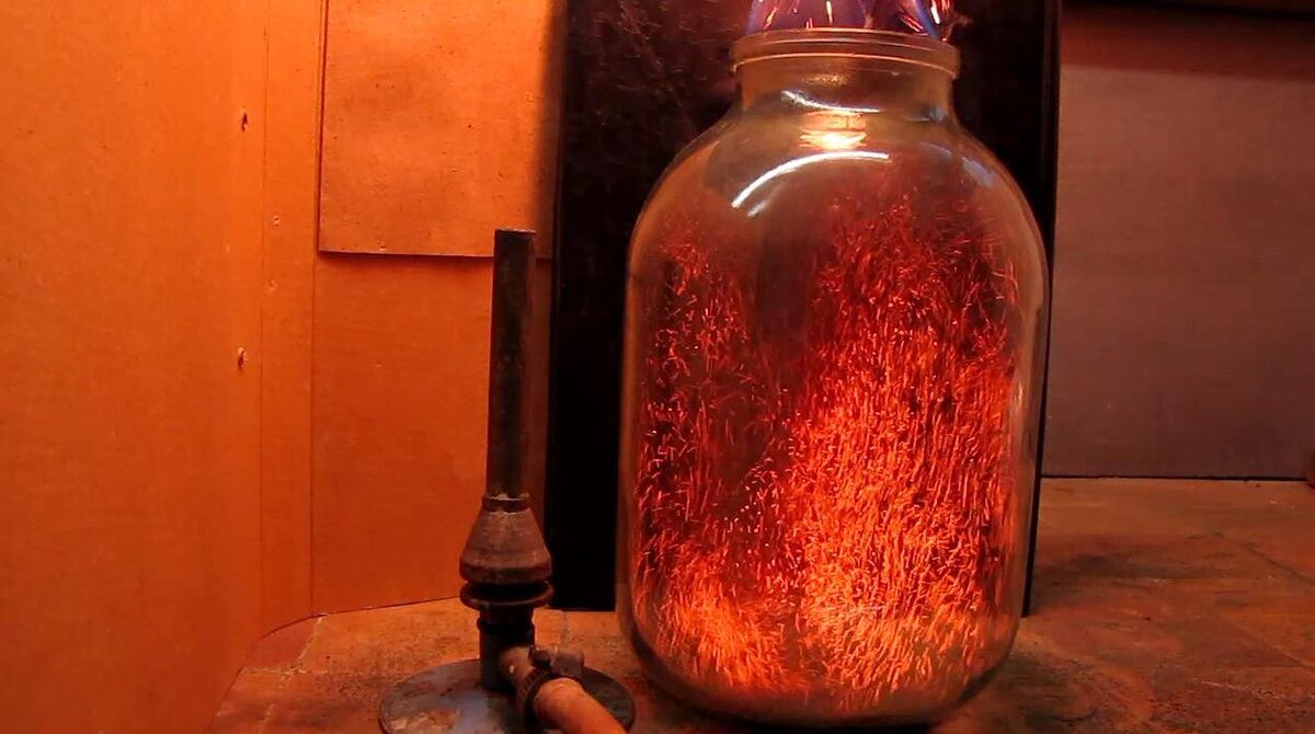 "Огненная метель" - один из самых красивых химических экспериментов. Сегодня мы посмотрим как осуществляется этот эксперимент. Техника проведения: Для проведения опыта нужно взять стеклянный сосуд объемом не менее 3 л и наполнить его аммиаком. Это можно провести двумя путями. Наиболее просто - налить в него 20 мл концентрированного раствора аммиака. Закрыть сосуд стеклом подождите около 10 мин, пока пары аммиака заполнят все пространство сосуда. Также можно насыпать на дно сосуда несколько граммов хлорида аммония либо нитрата аммония и едкого натра, а затем слегка смочить смесь водой и накрыть сосуд.