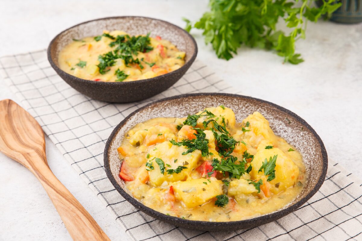 3. Разведите нутовую муку (это и есть наш секретный ингредиент!) в стакане воды и влейте в кастрюлю с овощами. Посолите, добавьте приправу и тушите под крышкой до готовности картофеля — 20-30 минут (в зависимости от сорта).