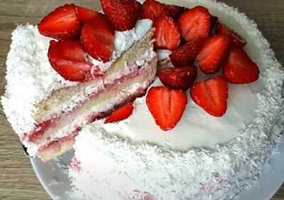 - Торт готов радуйте домочадцев изумительно вкусным десертом бисквитным тортом с клубникой и кокосовой стружкой.