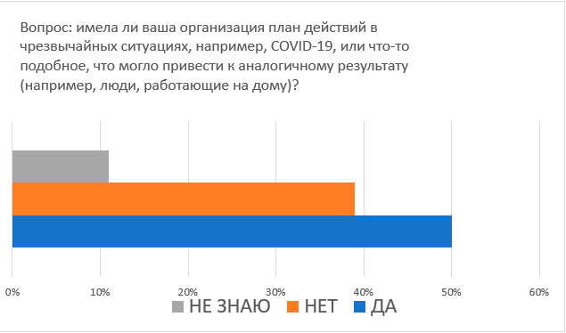 Половина специалистов информационной безопасности (ИБ) (50%) обнаружили, что их организации не имеют плана действий в чрезвычайных ситуациях или не знают, есть ли у них план действий в случае пандемии или другой чрезвычайной ситуации.