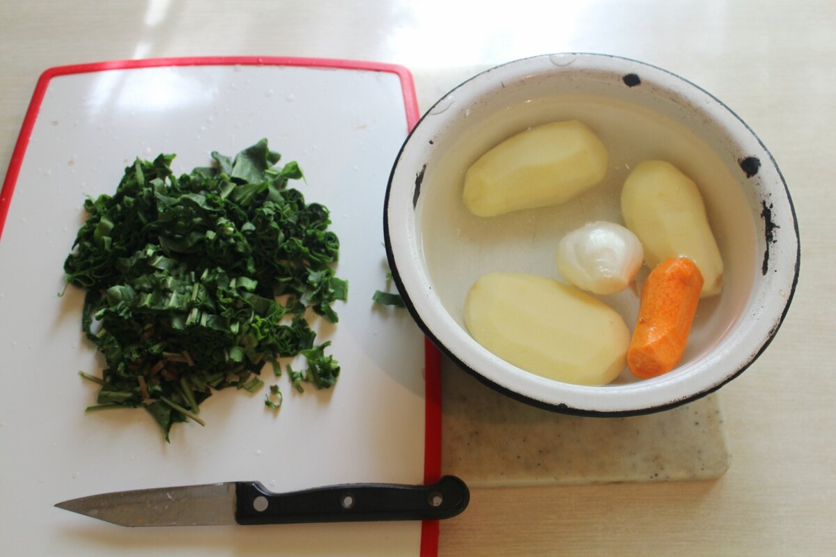 Щавель рос неподалёку от нашего огорода. Несколько простых шагов — и вот это уже основа для лёгкого летнего супа. Отец его вообще любит есть холодным, как окрошку. Я всё-таки разогрел. Сейчас поделюсь подробностями. Раз — и мы промываем щавель, который нарвали. Чистим немного картофеля, лука и моркови.