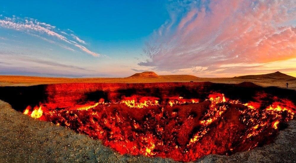 В Туркменистане в 1971 году геологи обнаружили подземное газовое месторождение. В результате раскопок пробной скважины и других раскопок геологи обнаружили подземную полость. В результате земля рухнула, образовав заполненную газом яму, и все горное оборудование рухнуло на нем. Было решено сжечь его, чтобы ядовитый газ не улетел. Газ все еще горит, хотя ожидается, что он сгорит через несколько дней. Путешественники окрестили это место «Вратами ада» или «Вратами ада».