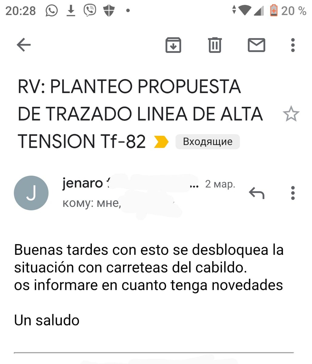 Начало тут. Потыкалась я, поныкалась, позванивая различным людям, и решила поговорить напрямую с сеньором Эрнесто из мерии, который это дело ведет. Ну и как оказалось, ничем похожим на дорожное управление не пахнет. А Хенаро говорил, что дело в шляпе, осталось получить заключение от дорожного управления( Выяснилось, что сейчас над проектом переноса кабеля работает индустриальный техник, а не дорожный, тоже сеньора. Ее наняла мерия (как и Хенаро чуть ранее, чтобы он проконсультировал их по переносу вышек ЛЭП). Так вот, она готовит отсчет, так как очень много норм закона, каждую из которых нужно учесть. А недавно вообще изменили закон, и теперь высота кабеля должна быть не 7 метров от дорожного покрытия, а 8. Короче, сейчас они ищут возможность привести проект в соответствии со всеми нормами, он мне сказал, что это не просто. На следующей неделе он ждет от нее отсчет. Посмотрим. Напоминалочку поставила)