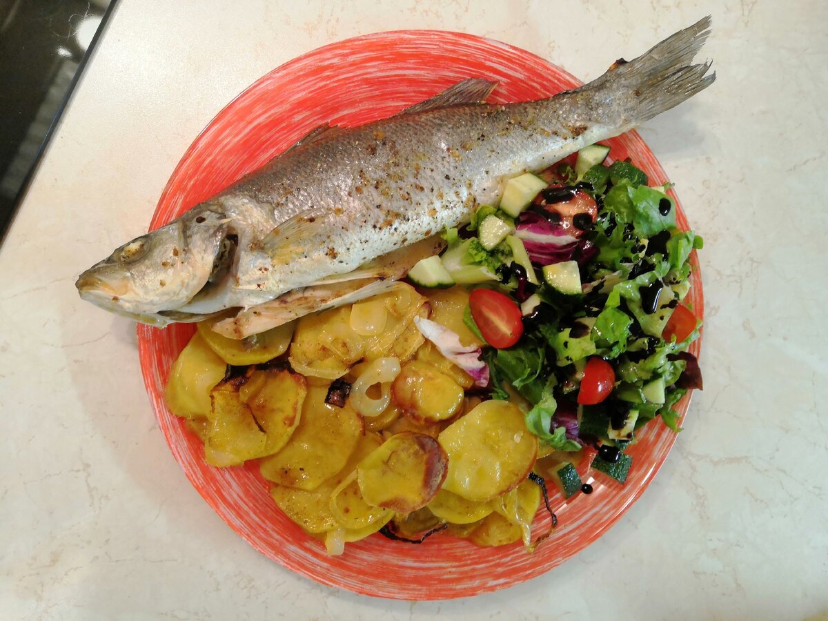 Всем привет! Сегодня приготовим очень вкусную и полезную рыбу Сибас, он же "морской волк" ! На 2 порции нам потребуется : Сибас - 2 шт Картофель - 4 шт Лук репчатый - 1 шт Долька лимона Долька чеснока Масло оливковое Соль, специи Тимьян, розмарин Итак приступим! 1. Чистим картофель и лук, нарезаем картофель тонкими кружками(слайсами), лук кольцами. 2. Выкладываем картофель в 1 слой на противень, сверху лук, соль, специи и сбрызгиваем оливковым маслом. 3. Ставим овощи запекать я в разогретую духовку минут на 10. 4. Чистим и потрошим сибаса. 5. Рыбу солим, посыпаем специями, внутрь кладём чеснок и лимон, смазываем оливковым маслом. 6. Достаём овощи из духовки, кладём сверху рыбу и ставим ещё на 15-20 минут в духовку. Можно добавить Тимьян и розмарин. 7. Рыба готова! 8. Сервируем, листьями салата и свежими овощами! Подписывайтесь на наш канал! Пишите комментарии! Ставьте лайки! Делайте репосты!