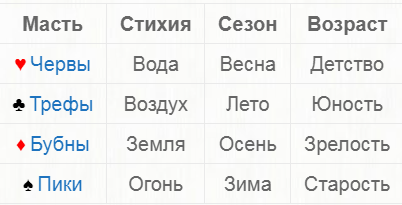 - 4 масти игральных карт представляют 4 периода возраста человека.