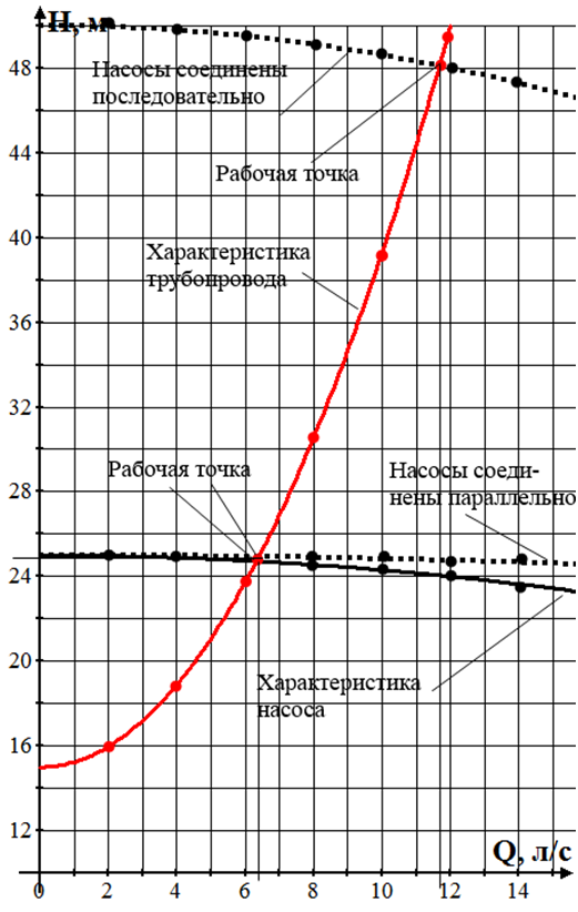 Строим на одном графике характеристики насоса и трубопровода. При последовательном включении насосов при одинаковом с одиночным насосом расходе напор увеличивается в два раза и характеристика насосной группы Н=2∙(25-0,0069 ∙Q2) , при параллельном включении при одинаковом с одиночным насосом напоре расход в трубопроводе будет в два раза больше и характеристика насосной группы будет