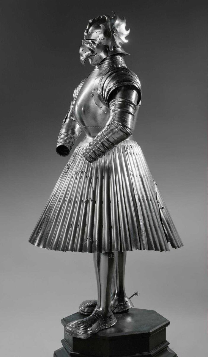 Эти костюмные доспехи для пеших боев, вероятно, когда-то принадлежали Маргрейву Альбрехту из Бранденбурга, герцогу Прусскому. Турниры Mummery - Jousting in Disguise сыграли важную роль в торжествах, посвященных важным княжеским событиям, таким как королевские въезды в город, коронации, государственные визиты, свадьбы или крещения. Они были идеальным способом повысить личный авторитет принца и его страны. Следовательно, броня функционировала как символ статуса дворянства. Альбрехт из Гогенцоллема (1490-1568), вероятно, заказал эту броню для пеших боев на свадьбу с Доротеей из Дании. Он был последним Великим Магистром Тевтонских Рыцарей; в 1525 году он подписал Краковский договор, который секуляризировал монашеское государство Ордена в стране, которая стала Пруссией, и дал ему возможность вступить в брак. Эта тщательно продуманная броня имитирует плиссированную пышную юбку; это типичный пример костюмированной брони, которая была чрезвычайно популярна в начале 16-го века и была вдохновле