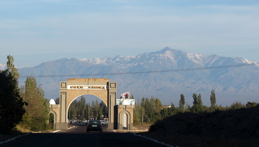 А за Нефтеабадом горы вновь отступают, открывая небольшой оазис, который я бы назвал Малой Ферганской долиной. На самом деле само название Исфара восходит к согдийскому Фархбаш - Благодатное место: здешний климат считается чуть ли не самым комфортным для человека во всей Средней Азии. На весь Таджикистан Исфаринская долина славится своими садами, а потому и на въезде в город Исфару (46 тыс. жителей) встречает... ну вы наверное поняли, что это персик?
