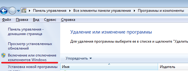 Для активации служб IIS необходимо зайти в Пуск->Панель управления и выбрать пункт Программы и компоненты, где необходимо выбрать пункт Включение или отключение компонентов Windows:
