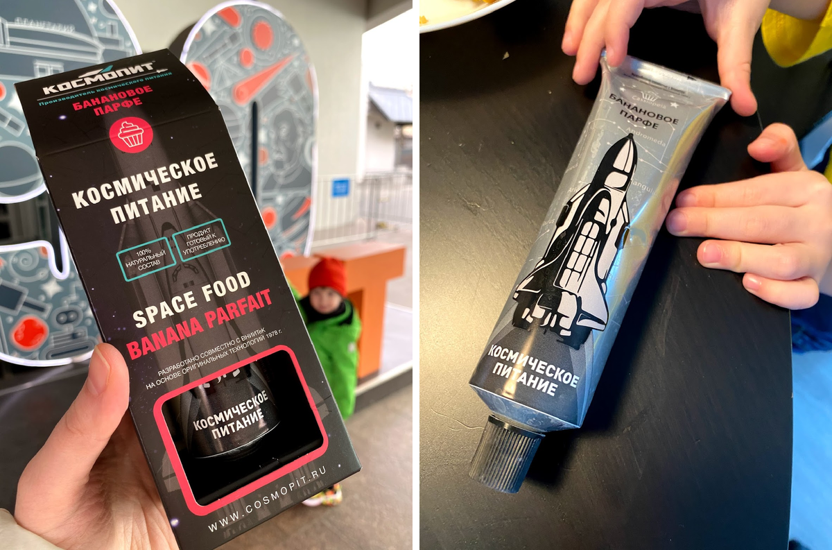 В качестве сувенира из Московского планетария принесли космическую еду. Огромная туба бананового десерта с манкой — 450 рублей.