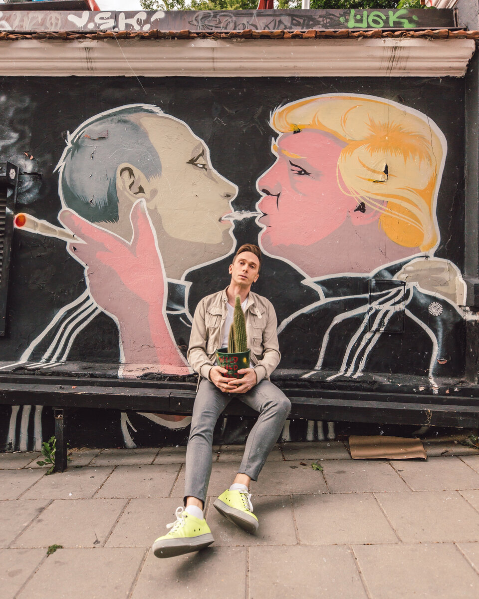Кто бы мог подумать, что всего за пару лет это место потеснит Башню Гедимина и ворота Аушрос в рейтинге самых популярных фотоспотов Вильнюса! Правда, это уже не первая версия граффити. В оригинальном варианте Путин и Трамп целовались взасос - так же как Брежнев и Хонеккер в известной работе Дмитрия Врубеля на Берлинской стене.