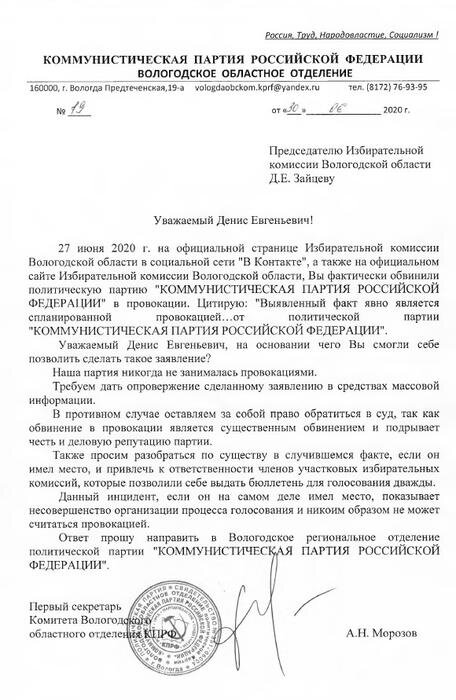 Вологодское областное отделение КПРФ направило протест председателю областной избирательной комиссии Денису Зайцеву в связи с его заявлением о якобы имевшей место «провокации КПРФ» на голосовании по поправкам в Конституцию. Партия готова обратиться в суд, если господин Зайцев не даст опровержение своего высказывания. Напомним, как возникла эта ситуация. 27 июня на сайте облизбиркома появилась информация о том, что на одном из избирательных участков Вологды было отмечено двойное голосование: женщина сначала получила бюллетень в помещении своего участка, а через некоторое время ей выдали второй бюллетень на «участке» на придомовой территории. Председатель облизбиркома Денис Зайцев без какого-либо расследования обстоятельств произошедшего назвал действия избирательницы «спланированной провокацией» со стороны КПРФ. Буквально через полчаса информацию с цитатой Зайцева начали распространять в СМИ и в соцсетях по тем же каналам и с тех же аккаунтов, с которых обычно распространяет агитматериа