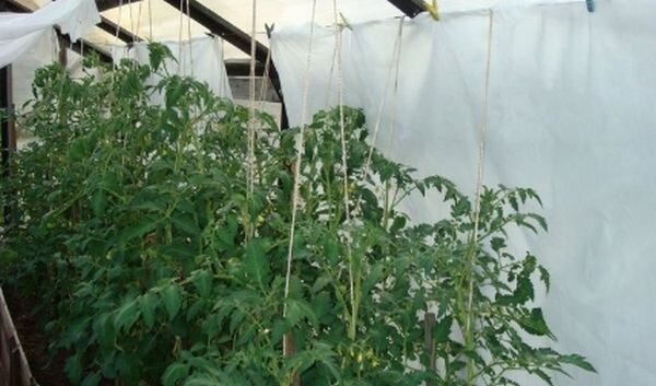 В продаже сегодня есть специальные затеняющие сетки. Чтобы защитить от жары помидоры, нужно зафиксировать ее сверху теплицы. Если в хозяйстве отыщется ненужный тюль либо простыня, можно использовать ее.