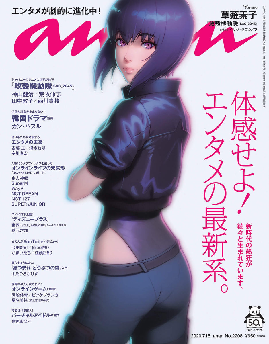 Мотоко Кусанаги - главная героиня серии «Призрак в доспехах» дебютировала на обложке журнала моды anan. Рисунок для обложки выполнил дизайнер персонажей нового аниме по вселенной «Призрак в доспехах: Синдром одиночки 2045» Илья Кувшинов. Обложка представлена в 2208-ом выпуске журнала, который поступит в продажу 8 июля.